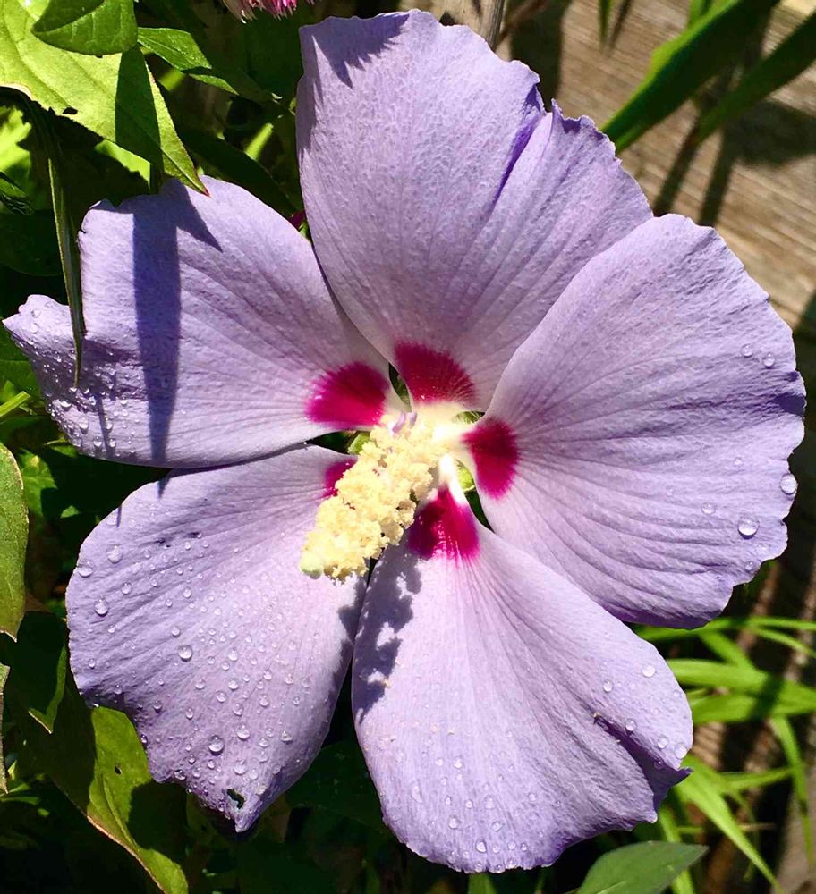 ムクゲ(ブルーバード)は高さが240cmまで達する落葉低木で、夏から秋にかけて花芯が赤いパステル調の淡い紫色の花を葉腋に単生させ茎下から上に向かい次々に開花させる園芸品種です。