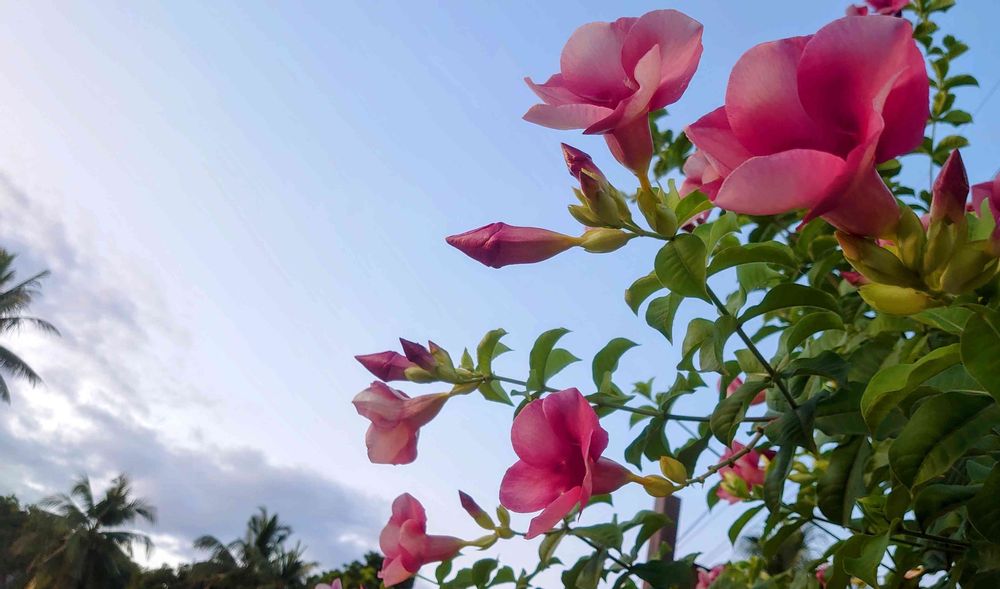 こちらはパープル(ピンク?)のアラマンダ。夕暮れの空によく似合いますね。