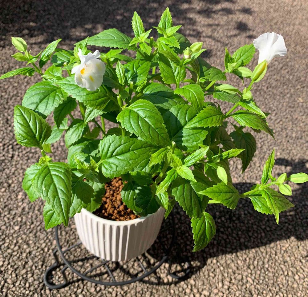 おはようございます。8/21(日)に、挿し芽トレニアをスリコの鉢に植え替えました。半日陰での養生も終え、そろそろ日向エリアで雨ざらし放置にします。