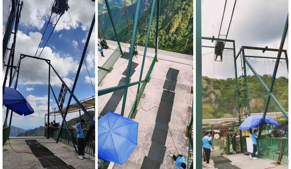ちなみに、事前にスカイダイビングで使うようなハーネスを装着して、命綱を付けて、真ん中の写真の🟩のマットの先端辺りにある椅子まで行き、椅子に座って安全バーを下ろしてハーネスと椅子をピックで固定されると命綱は外されます。