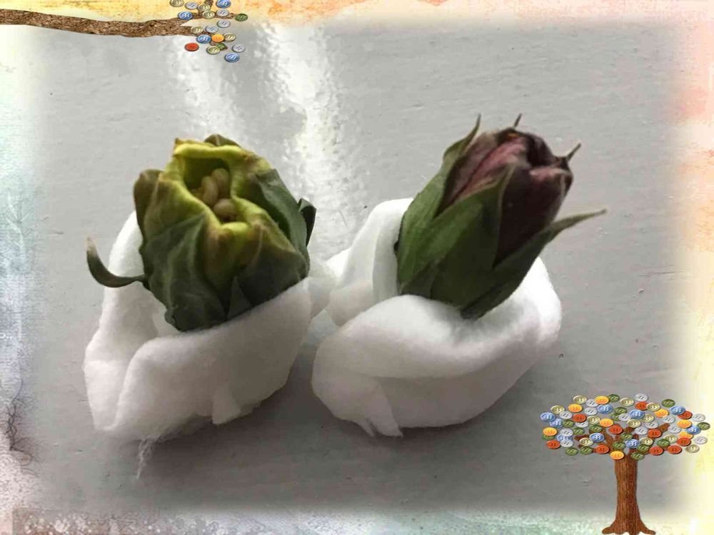 通勤タイムに大雨の洗礼を受けた日、帰り際に園芸部の部長が、部で育てているハイビスカスから取れた蕾を持たせてくれました。
