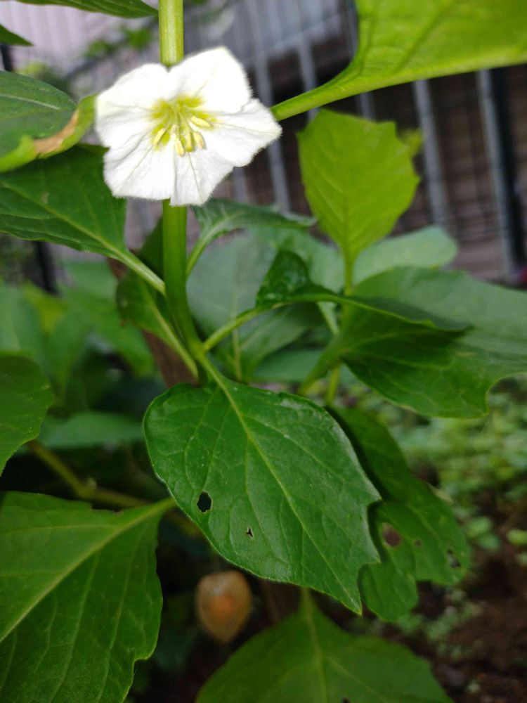 実家から貰ったほおずきの苗に花が咲きました。もともと下の方に実が付いていたけど枯れてしまったと思いながら放っておいたら、網ほおずきになっていて、それも嬉しいです⸜( •⌄• )⸝。