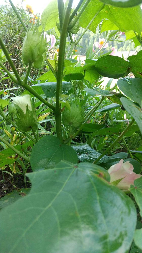 今日のお花、綿です。春に種子を撒いてどうなるかな…😅と思ってました。昨日咲いてました。今朝いってみたら、昨日のはピンクに、もう1つ咲いてました。虫さんにもやられてますがまだまだこれから咲きます。