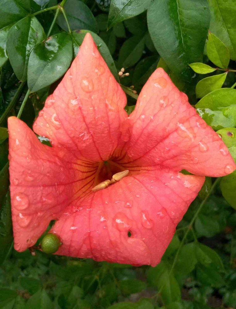 通りすがりに見かけました、敷地外に飛び出して咲いていました ノウゼンカズラの花☺️