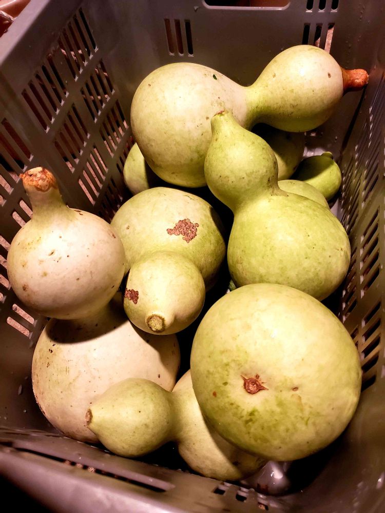 畑で育てたひょうたんを収穫…したけど持つとなんだか軽いし、中身がスカスカしているような…。今年は出来が怪しい。まだ畑に残っている分はどうなるか