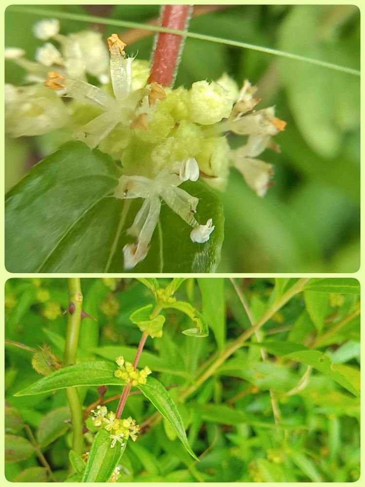 花は雌雄同株で、球形の花序が葉腋につく。雄花は長さ約4mmの柄があり、花被片は5裂し、裂片は倒長卵形、上部の背に横筋があり、毛がある。雄しべは5個。雌花はほとんど無柄、花被は合生し、卵形で先に毛がある。果時には果実を包む。