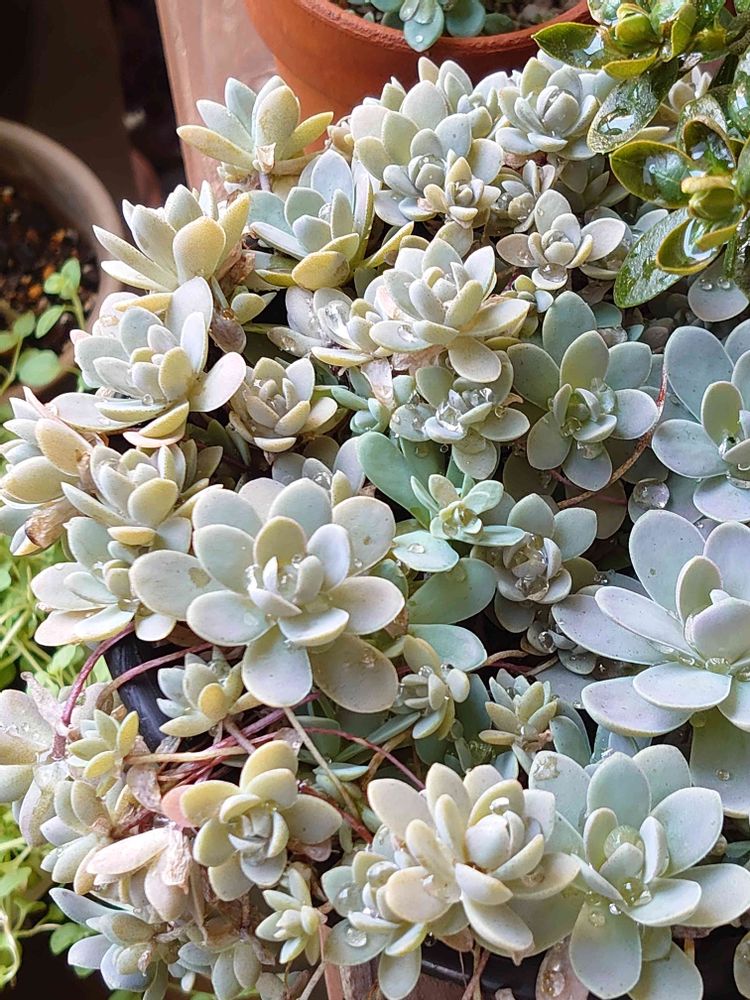 昨夜の雷雨⚡で花たちはまたずぶ濡れでした😅☔子持ち蓮華さんは軒下なのにすっかり濡れて、雨粒キラキラになってましたヾ(*´∀`*)ノ💚✨