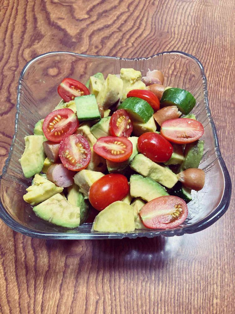 夏野菜フォトコンのため、料理載せてみました。コロコロサラダ。アボカドに合わせてわさびドレッシングを作って食べました😋