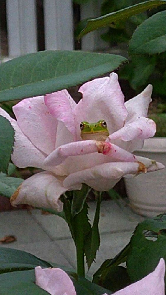 蛾の幼虫(・Y・ )⌒)⌒)oが薔薇🌹サンを食べていたので気になっていました😊そしたら、雨蛙🐸サンがいたのできっと食べてくれたのかもしれません👍