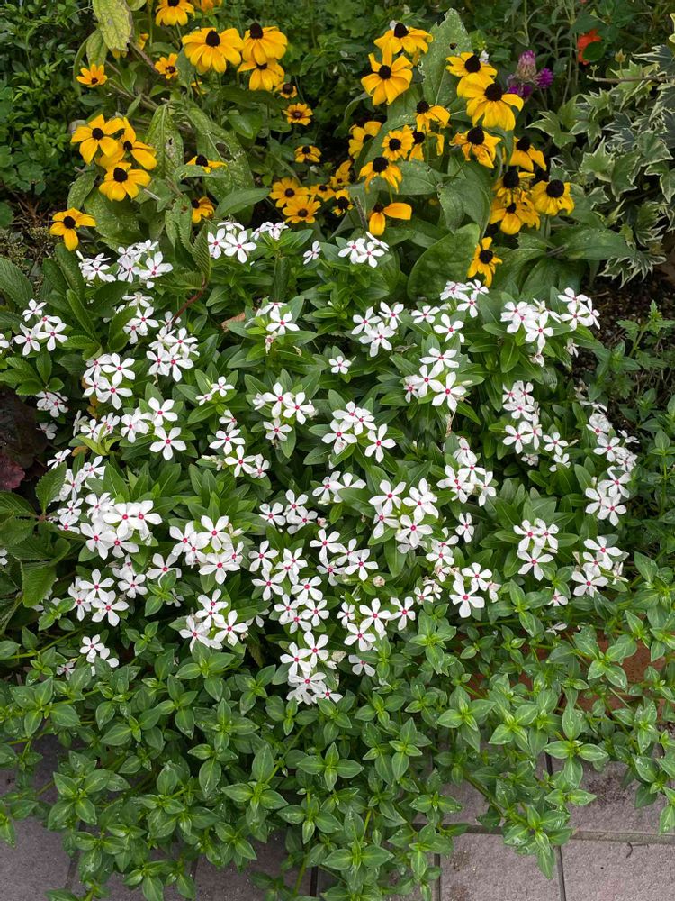 花壇からはみ出してきてますがフェアリースターさんが最盛期のようでいっぱい咲いてくれてます😆奥には2年目ルドベキア。手前は こちらも二年目のピンクネックレス…のはず❗️モリモリに葉は育つものの花の気配なし😑え、あなたホントにピンクネックレスさんですよね?実は雑草さんとか⁉️…まあもう少し見守る事にしよう😅