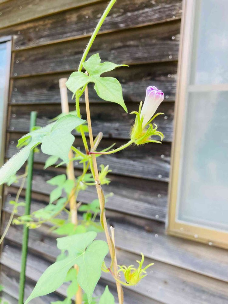 朝顔の背後に写っている外壁は、畑作業用の作業小屋です🍆🧅🥬