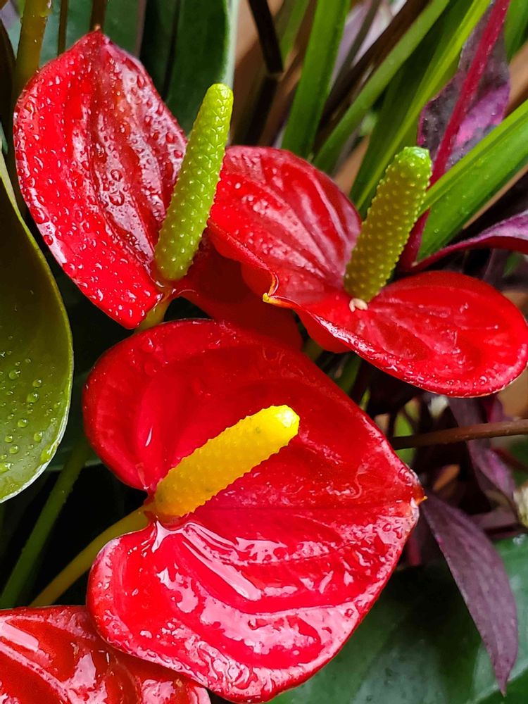 真っ赤なアンスリウム光沢があってステキです。寄せ植えにしたら華やぐことでしょう。❤️👍