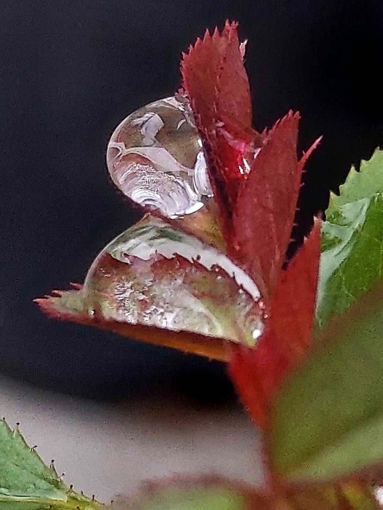ミニバラ🌹の葉(若葉)🌿に水滴がとても幻想的で綺麗でした💖