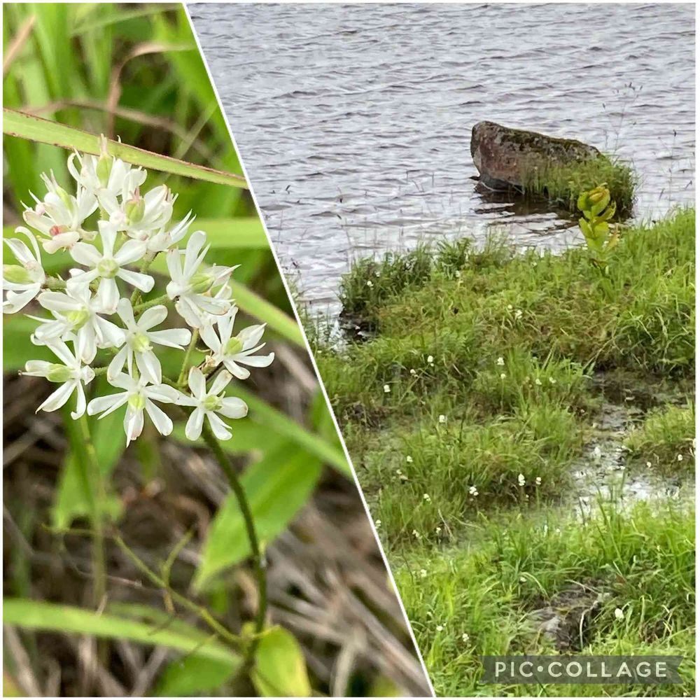 イワショウブです。岩じゃなく亜高山の湿地、池塘などで咲く花です。花径1cmもない小花の集まり。葉っぱが菖蒲に似ているらしいのですが近くで確認してません💦写真右遠くに白い点々が多分イワショウブの群生です。8/16八島ヶ原湿原