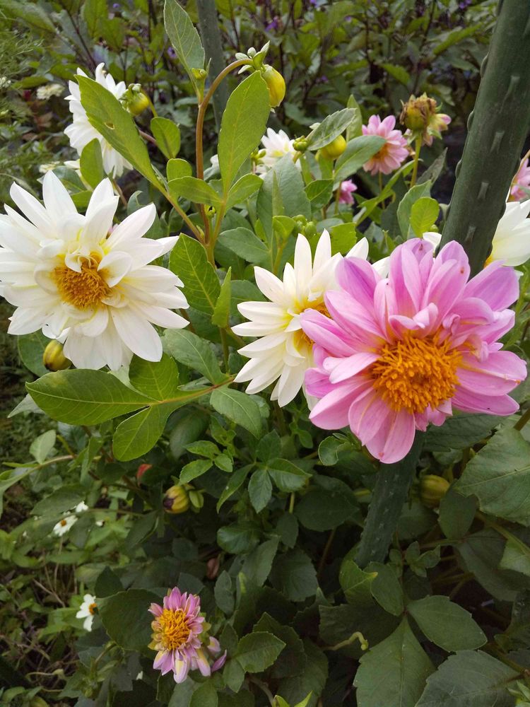 は〜い背丈も花も小ぶりのダリアです色んな色が入っていますよ💕💕💕