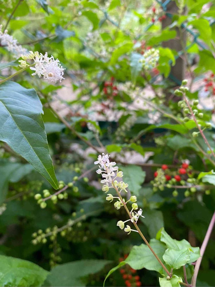 庭の一画に、こぼれ種からの数珠珊瑚(ジュズサンゴ)が白い花を咲かせ、赤い実をつけています。