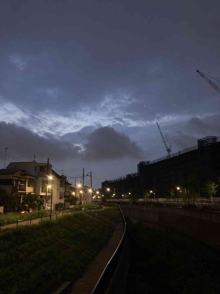 リハビリ散歩に行く途中の石神井川の上御成橋にて、4時44分…ここでいつも朝焼けを見てましたが暗いです🌃上御成橋にて…