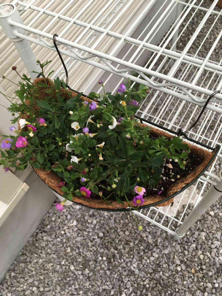 ダイソーで買ったハーフの3号ハンギングバスケットに、ステラと姫小菊(ブラキカム)を寄せ植え。