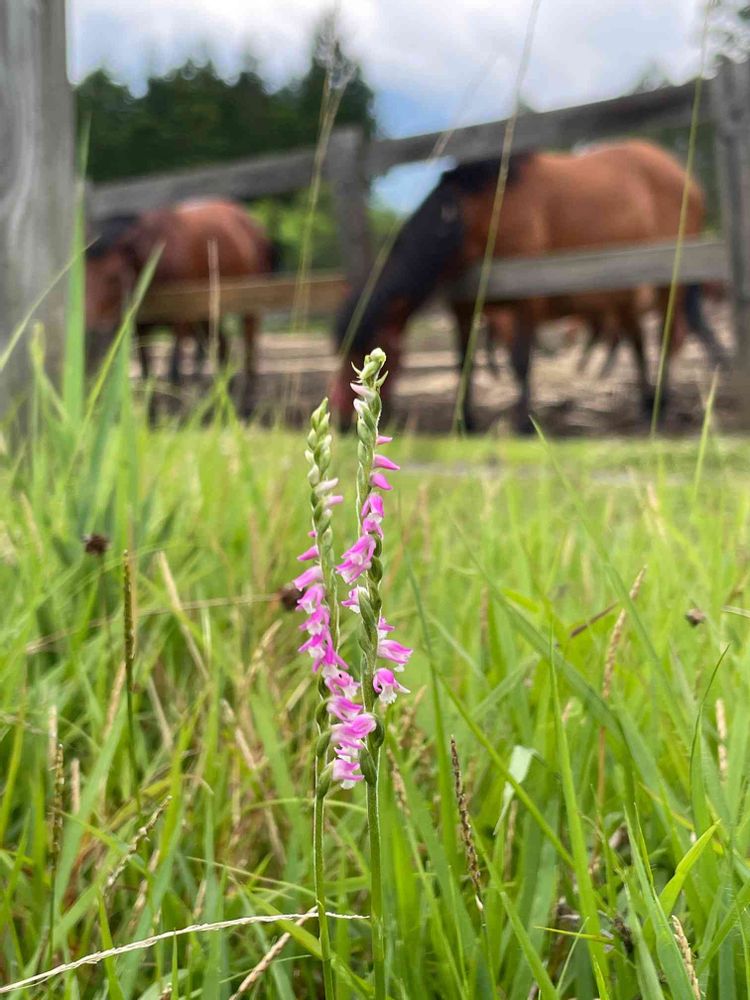 草を食べる木曽馬の前にぽつんとピンクの可愛い花