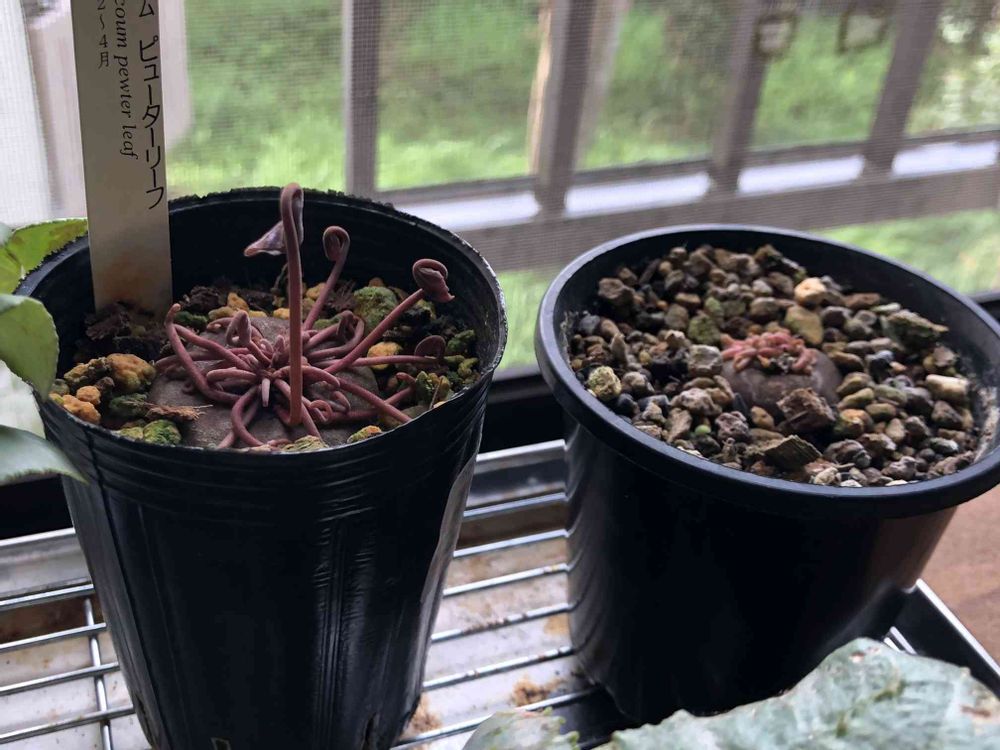 原種シクラメンのコウム。植え替えようと思いつつタイミングがよくわからないままですが動き出した。今年はヒョロヒョロにならないと良いなぁ💠もうちょっと土被せた方がいいのだろうか