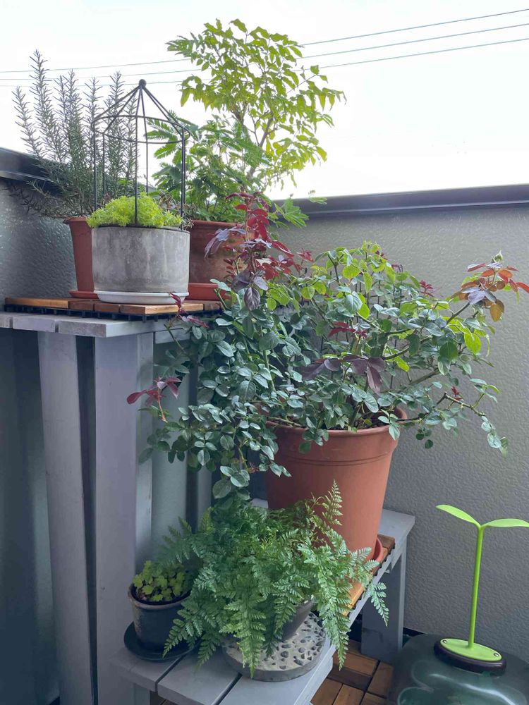 下段奥から、ミニバラ、ダバリア、大文字草。ベランダガーデンは、思い立ったらすぐに手入れできて、気軽で楽しいですね!