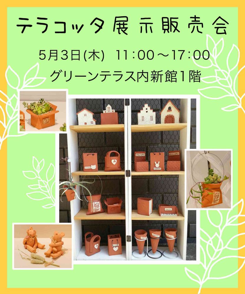 明日5月3日(木)にテラコッタ展示販売会を、11時から17時までオープンしたばかりの新店舗で開催いたします(^^)