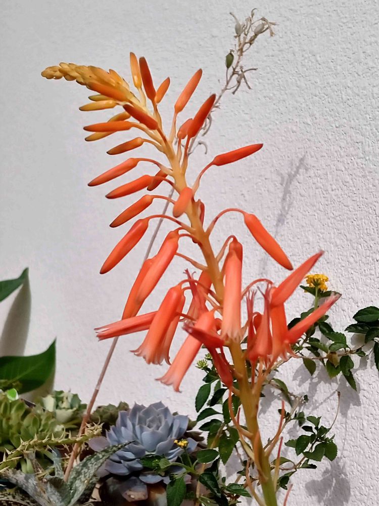 後ろに見えるのはアロエ ホワイトフォックスの種。上手く受粉できると、ぷっくり膨らみます😄