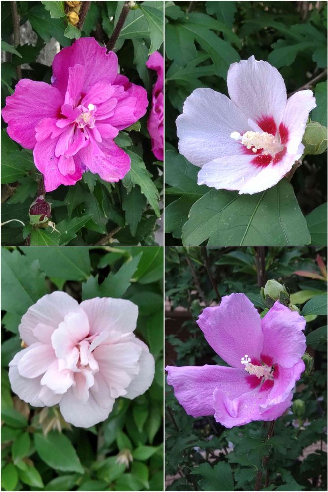 ムクゲには 一重 八重 半八重があり 左上のピンクのムクゲが 半八重です。