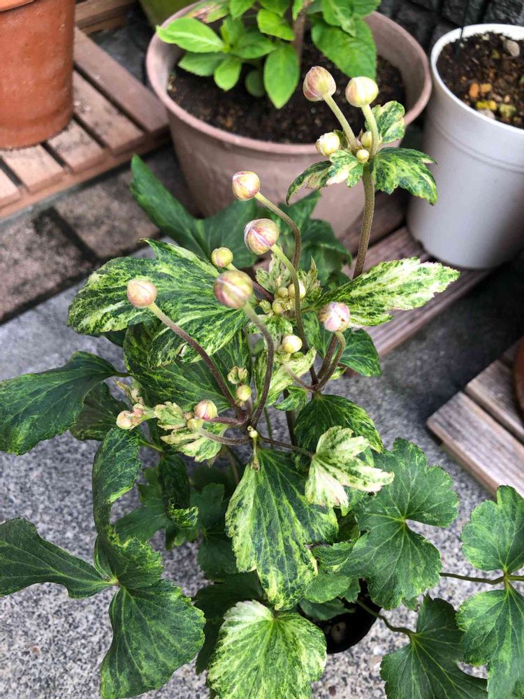 初音という名前の斑入り秋明菊でピンクのお花が咲きます🎶