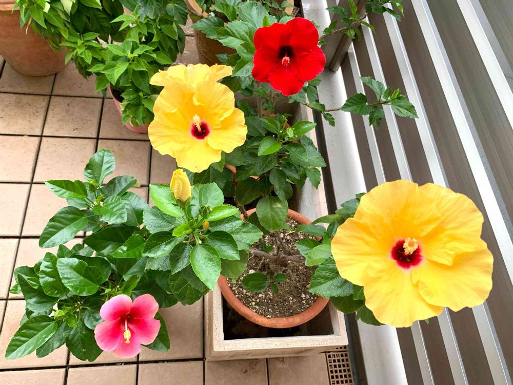 3色のハイビスカス🌺が咲いてベランダが明るくなっています❤️💛💗