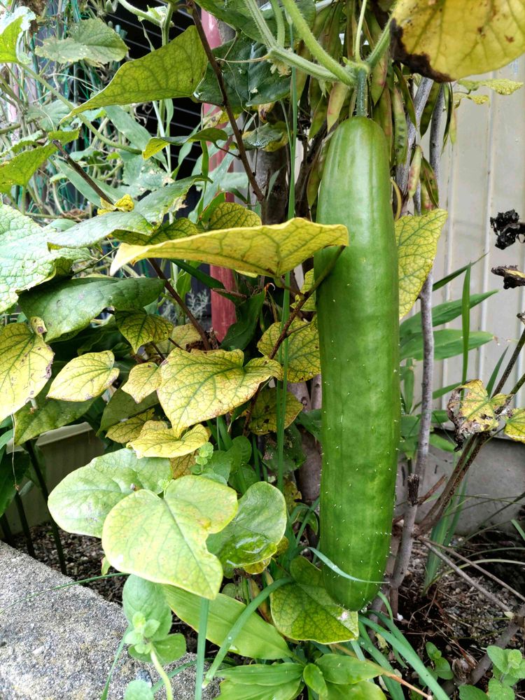 きゅうりのつるが隣の木に巻き付きその内に花が咲いてきゅうりが育っていたみたい。枯れた葉っぱを取り除くとでっかいきゅうりが現われた〜よ🤣毎日、元気に鳴いてくれる鈴虫さんへのプレゼントだな。