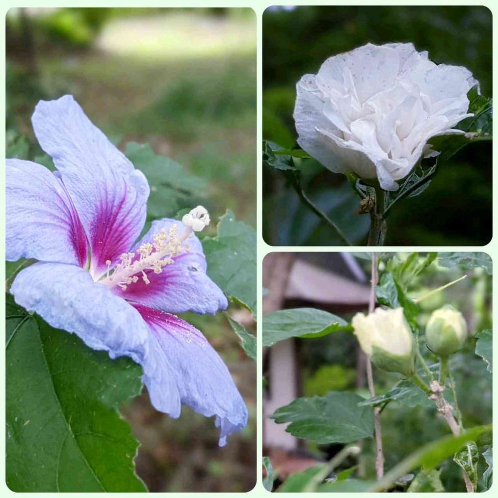 左はピンクが少しブルーがかったブルーバード 右は名前は判らない八重の白い木槿です