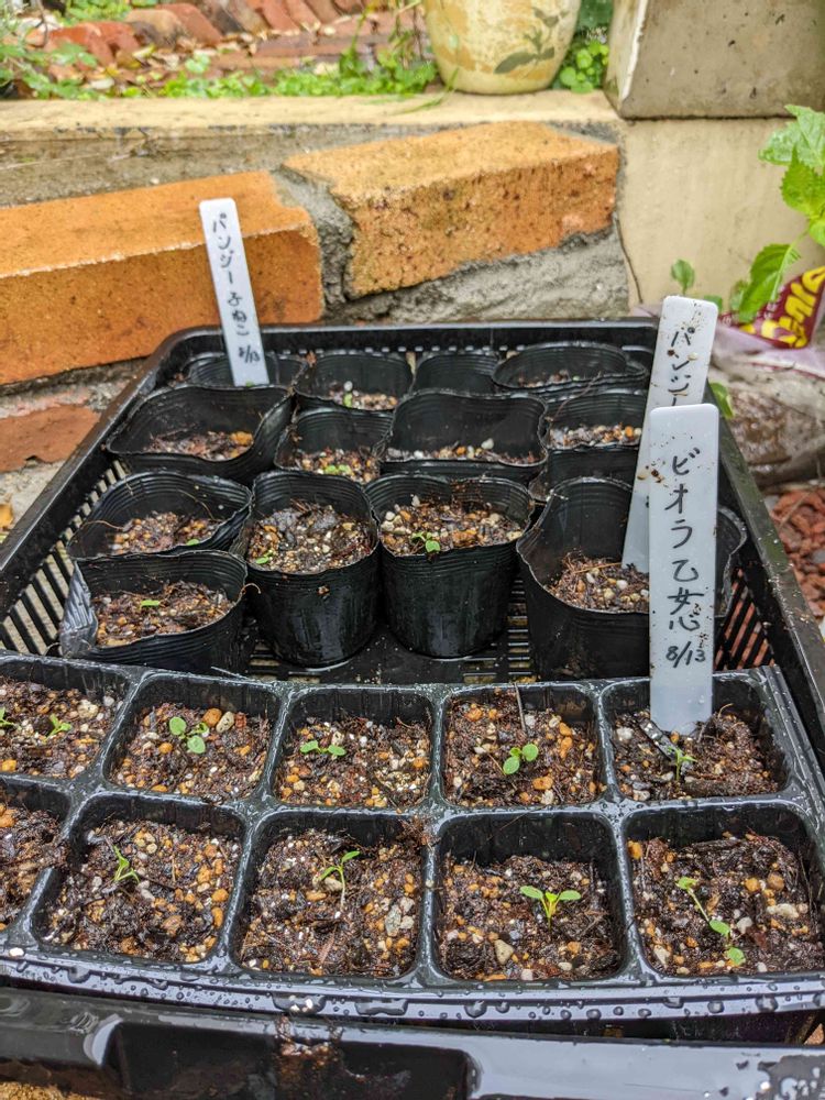8月13日種まきしたパンジービオラをポットに鉢上げ。また本日はストックの種を撒きました。