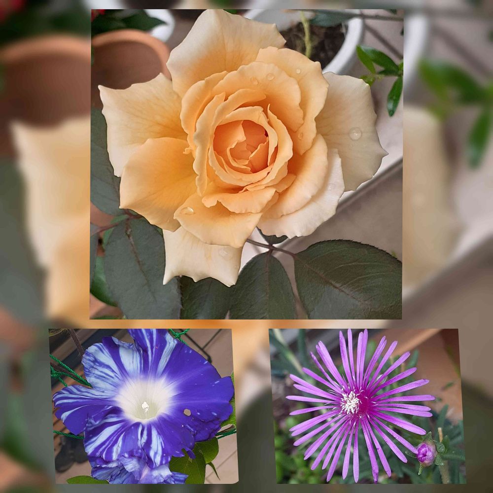 今日の庭の花。バラ ジャストジョイがまた咲きました。たくましい。マツバギクもやっと咲き、アサガオも新しい模様が咲きました。