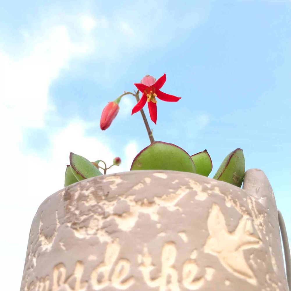 リガーデンの記念に頂いた多肉に愛らしい花が咲きました。下から撮らないとお顔が見えない😊