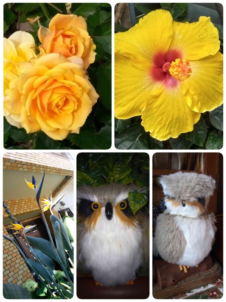 今日は焼き肉の日だとか~語呂合わせで~8月だから焼きが+されて「焼き肉の日」らしいです~29日は普通に「肉🍖🍗の日」だけどねぇ~⁉️⁉️⁉️最近は年のせいか肉は余り食べられない~胸が悪く成る~(笑) 「ご近所さんのお写ん歩①」 黄色いお花💐を集めて見ました~バラの名前は~???だけどねぇ~??? 🏷️付け出来なかった~植物の名前は打てたけど~???間違ってるんかな~??? 今日はフクロウ祭り様に亡き義姉宅で玄関に鎮座してたフクロウさん…出入りする度に~クックル~クックル~って啼きます~フクロウも鳩の様に啼くのですねぇ~⁉️ 実際に聞いた事無いから~(笑)(笑)(笑)左側のフクロウは玄関に招き猫様と一緒に鎮座して居ります~👌✌️👍😉
