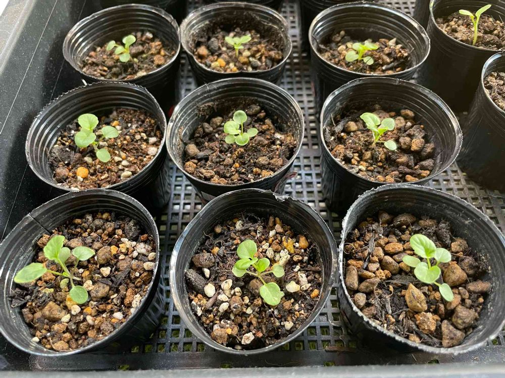 ポットも黒、カゴも黒で、めちゃくちゃ暑いと思うんですが、ベビ苗ちゃんたち頑張ってくれてます😭