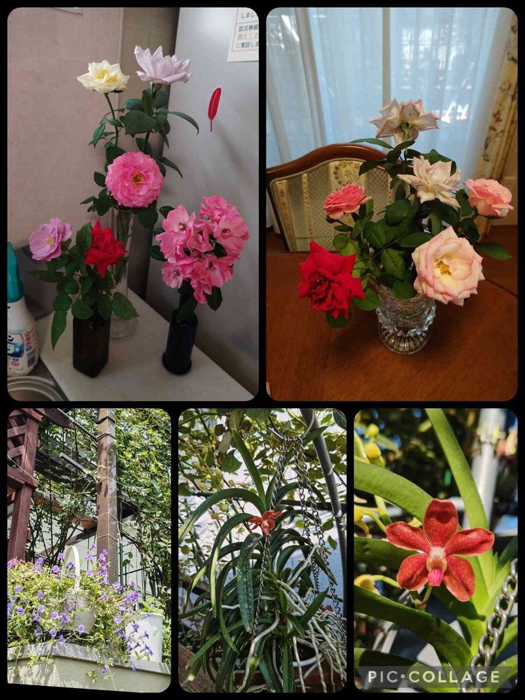 薬剤噴霧前にバラを十数本切って、2階のキッチンのテーブルに置いた。すると、妻が写真上段の二枚の通りに、アレンジしていた。妻は私の顔を見ると、「お父さん、バラ、ありがとう🌹」と言ってくれた。とても嬉しい瞬間をいただいた。