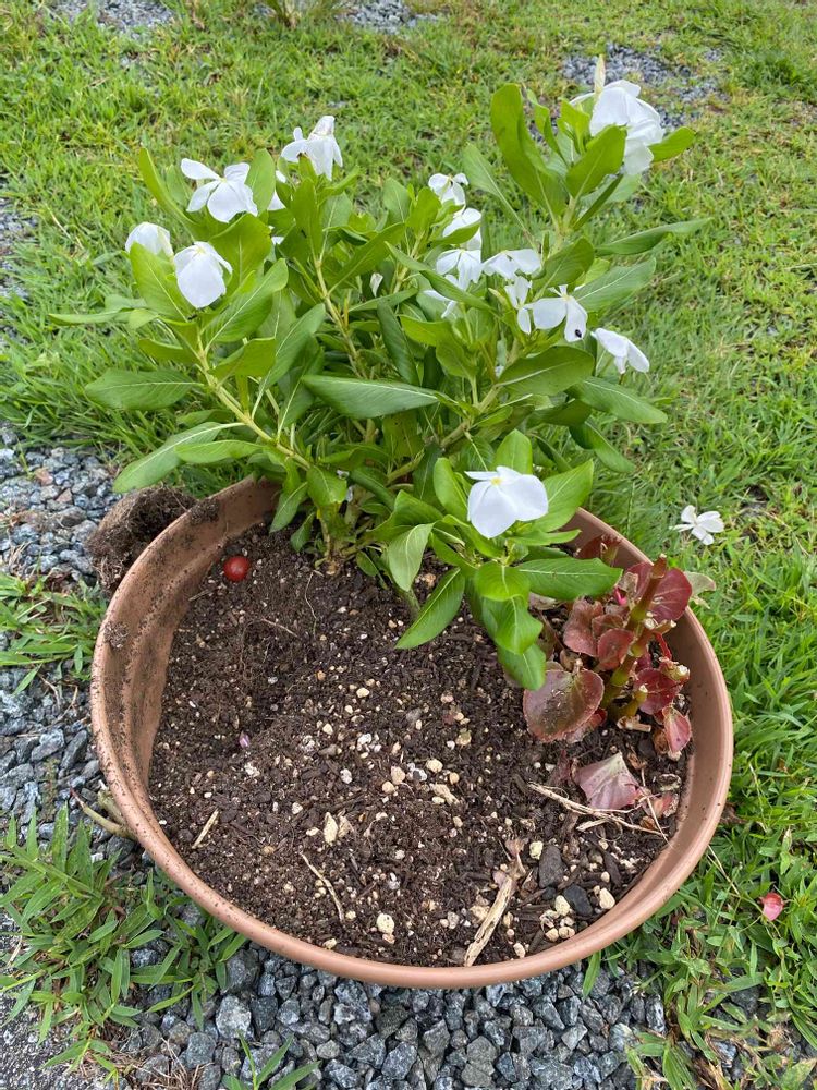来年は、ニチニチソウでベゴニアをブロックした寄せ植えにしよう。笑