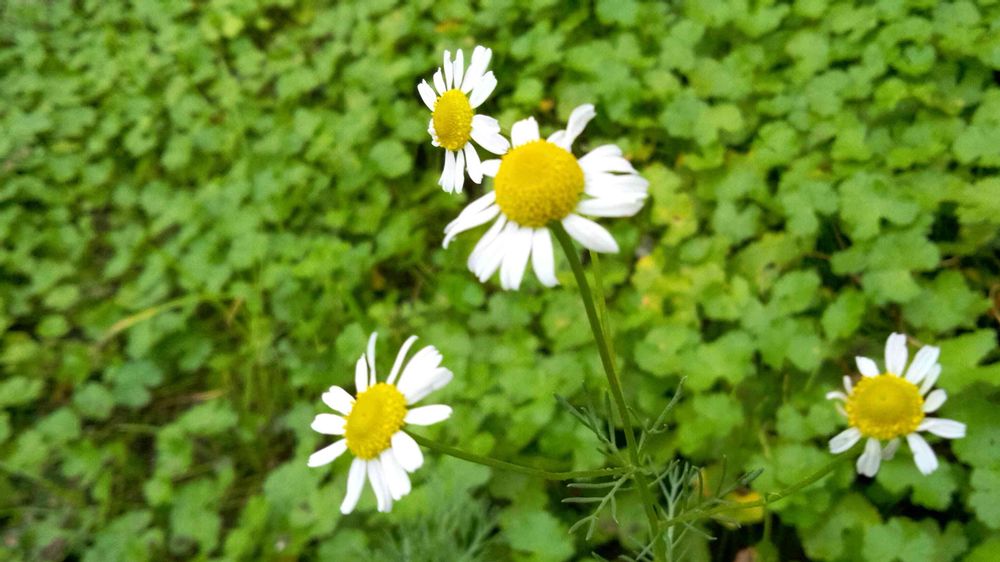 春に種をこぼしておいたカモミールが発芽して、花を咲かせている株もありますよ☺️