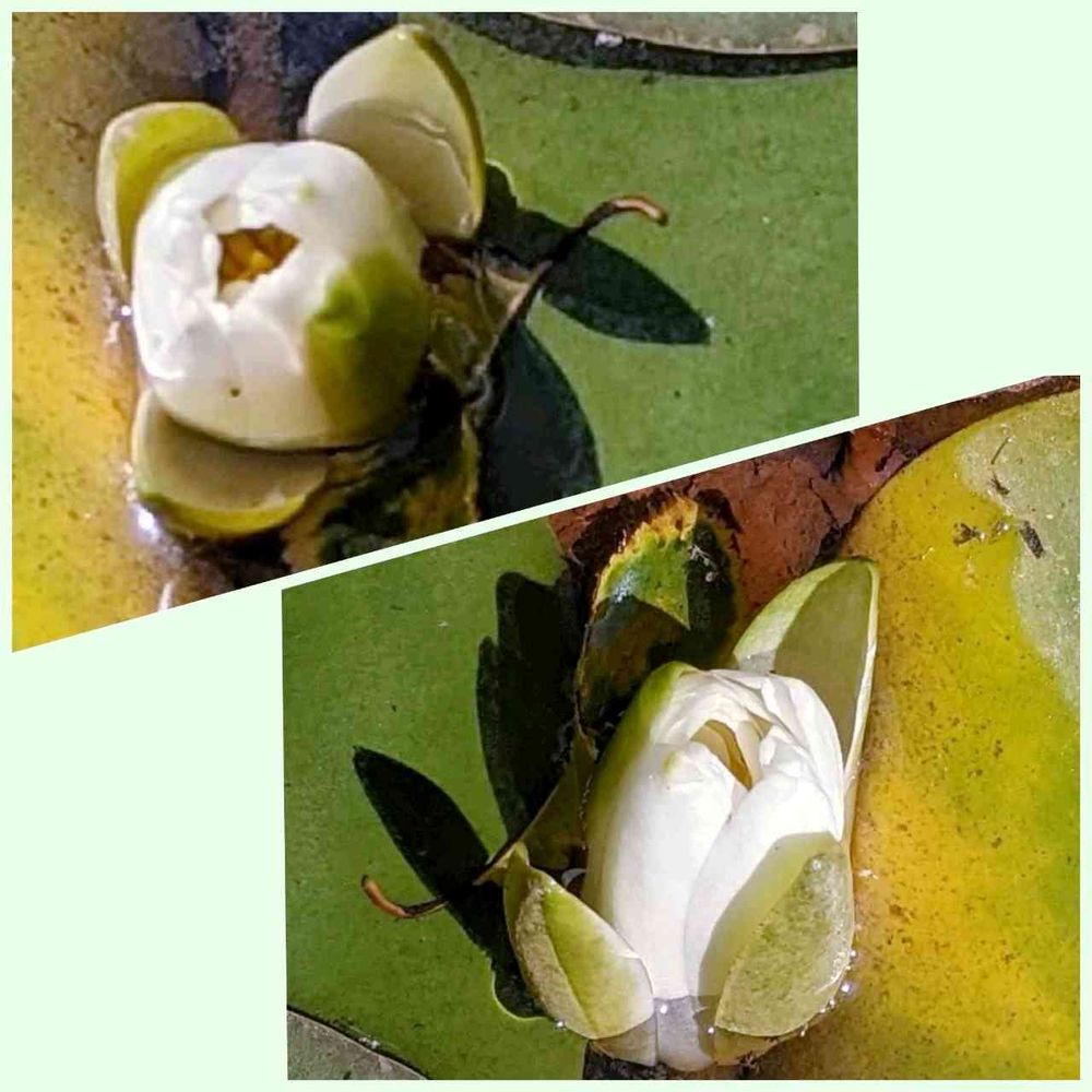 今朝5時過ぎに少し開いた鉄鉢の睡蓮を見て頂きましたが 午前10時半にやっとここまで… そしてお昼 夕方…このまま閉じて少し水に浸かってしまいました 明日にはもう完全に水中に没してしまうでしょう