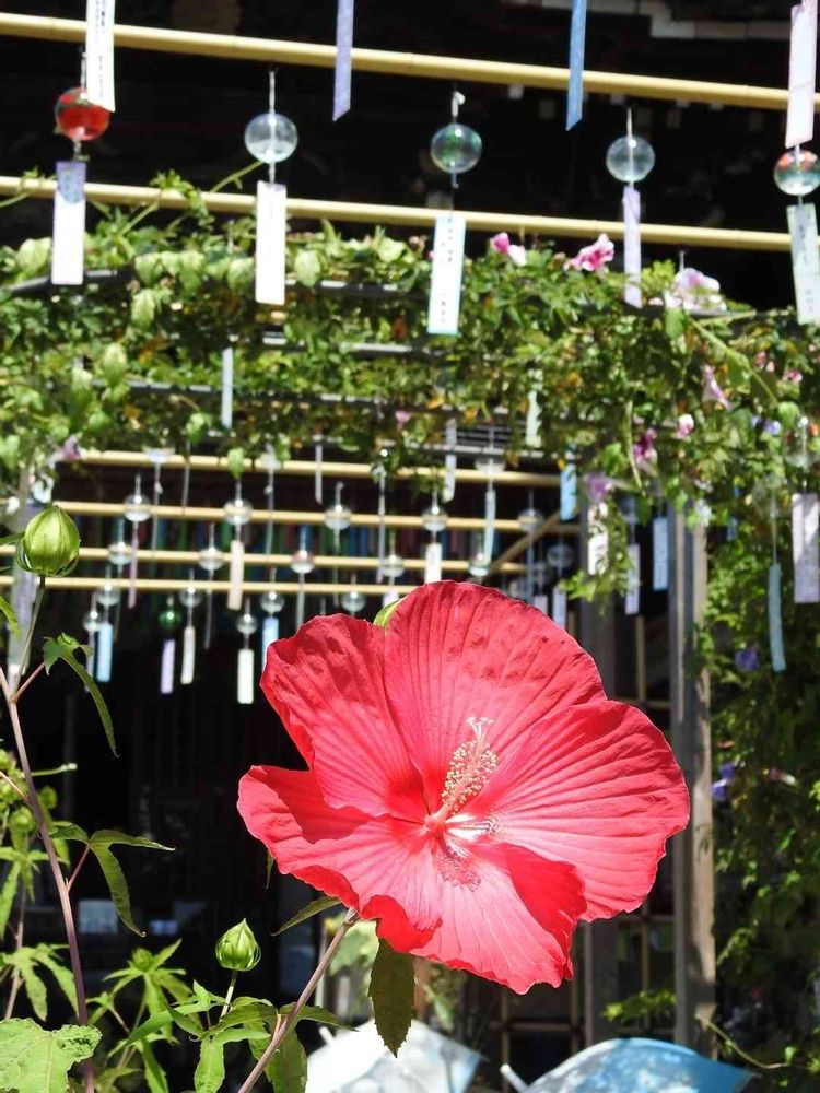 きれいな👂音色を聞かせてくれる👂沢山の風鈴とイキイキと咲いていた綺麗な大きな花🍀🌿🌱
