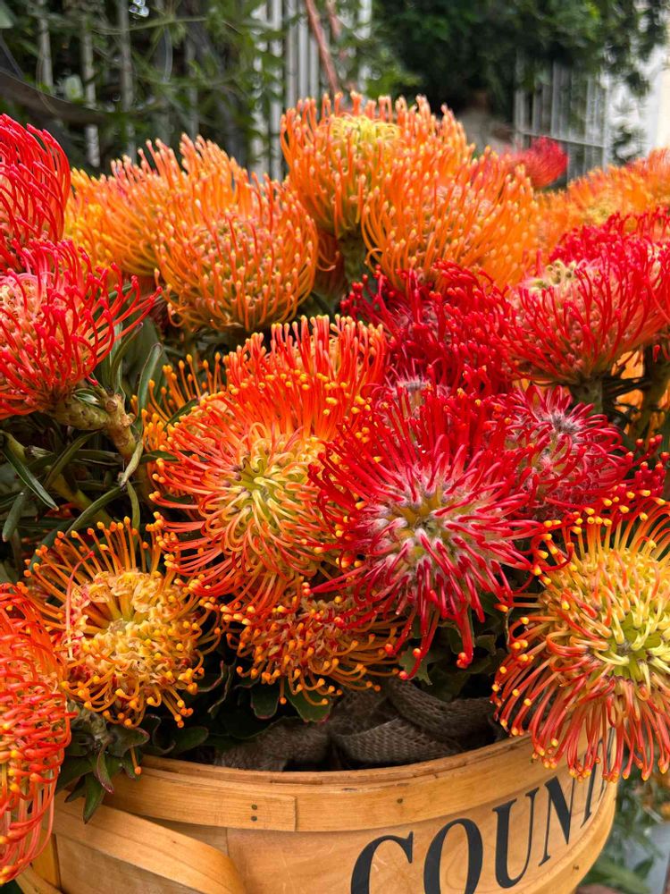 木のバケツから溢れ出ててくるようなピンクッションのディスプレイ✨鮮やかなな色に目が釘付けです。