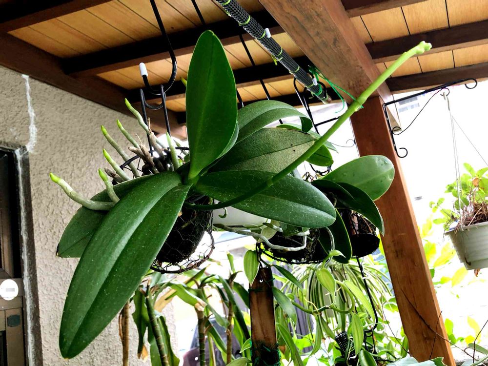 軒先に吊るしていたところ、根と花芽が伸びてきました。