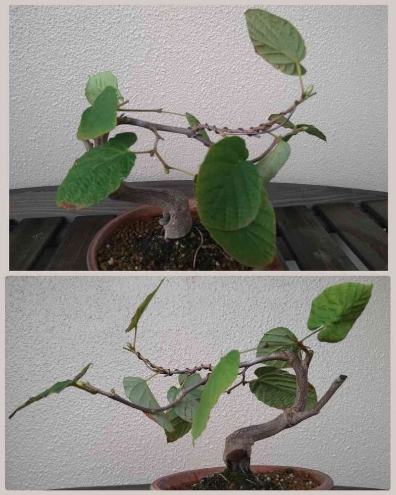 2年前の晩秋、落葉後に枝ぶりの美しさに惹かれお迎えした。花はまだ見ることができていない。今年、主幹の上へ真っ直ぐに伸びてきた枝が目立ったので、今日針金をかけ前方奥へ枝を倒した(pic 下)。主幹の「つ」の文字のような形の流れを活かしてみた。pic 上は裏から見たもので針金をかけた枝の倒した様子が見える。