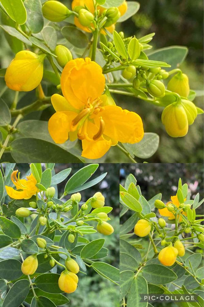 ☘️コバノセンナ☘️.....かわいぃね、この丸い蕾がほどけて明るく輝いて咲いてきたよ✨🌼🌼🌼✨💕南アメリカ原産、マメ科、常緑。耐寒性は弱いらしいんだけど、暖地のこちらは野外で越冬、もう2メートル近くになったよ🤭🫧🫧🫧✨