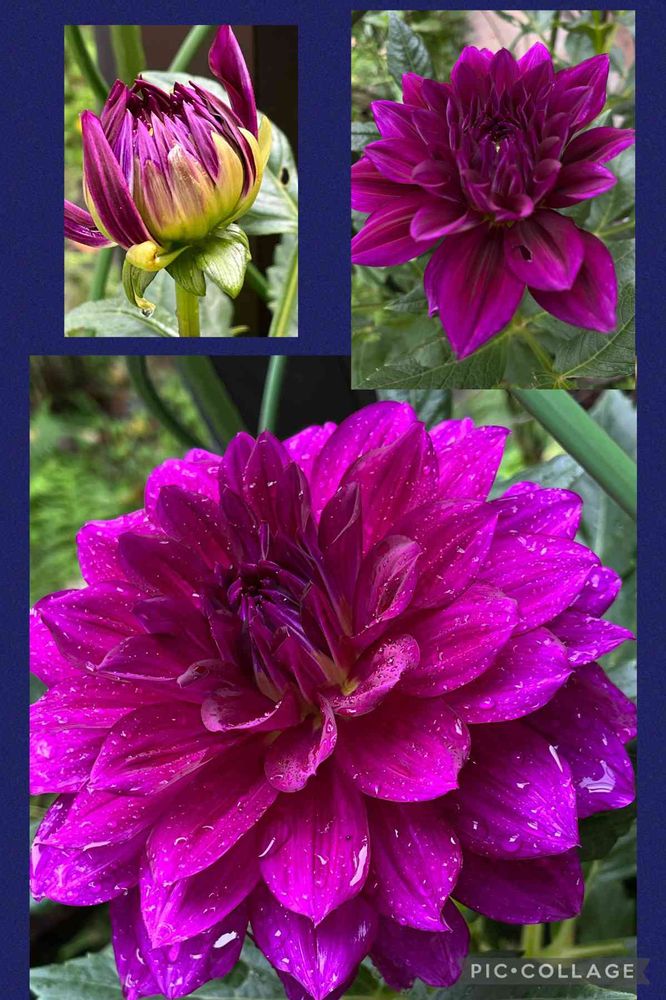 ダリア 白夜の太陽💜💜左上〜下時計回りに咲き始め〜満開です⭐️🎊🌈満開時に少し雨に降られました☔️置き場所がテラスの端っこなので💧