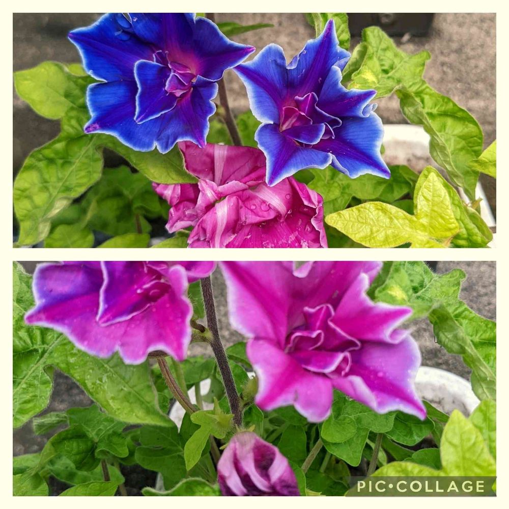 種をまきやっと咲いた桔梗咲朝顔ですが、上が今日の午前10時頃、下が午後4時頃の花の色。変わることに感動しています💜