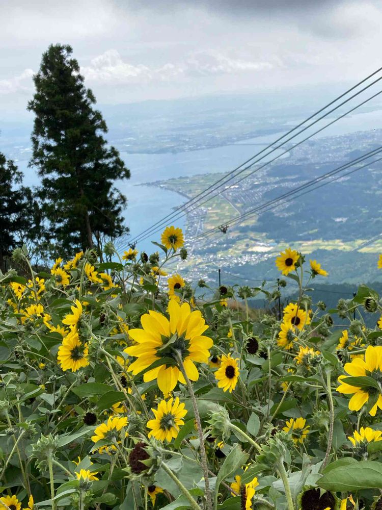 姫ひまわり越しにみる雄大な湖