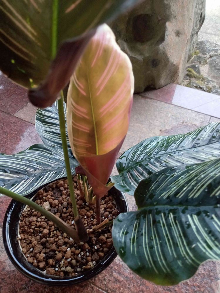 カラテア サンデリアーナちゃんの葉っぱが開きかけました🙌🙌🙌凄い初々しい色合いに驚きと感動✨